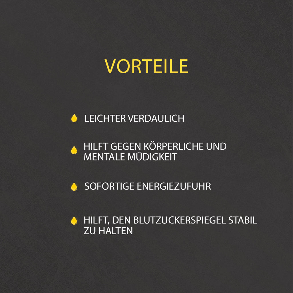 Energy Gel bildet die Grundlage für den neuen Ansatz der GoldNutrition-Gele. Dieses Gel liefert schnell 25 g leicht verdauliche Kohlenhydrate, gewonnen durch die Kombination von Maltodextrin und Fruktose, wodurch der Zuckergehalt im Verhältnis zur Gesamtkohlenhydratmenge reduziert wird. Die Kombination von Maltodextrin und Fruktose verringert die Osmolalität, erleichtert die Verdauung und verringert das Risiko von Darmbeschwerden während des Trainings oder bei Prüfungen.