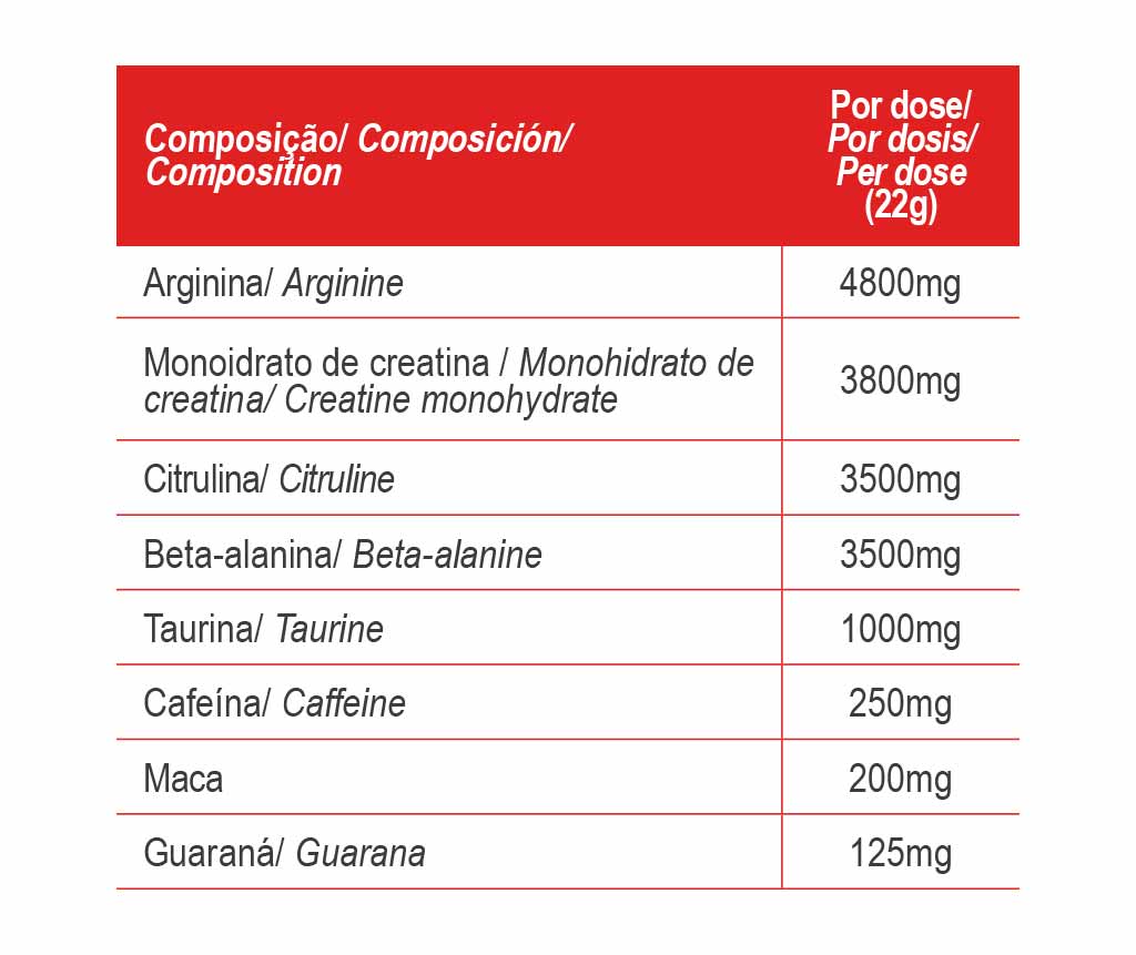 Auswirkungen vor dem Training Unterstützt die Muskelregeneration und verzögert die Ermüdung, sodass Sie beim Training maximale Leistung bringen. Kombiniert L-Arginin (Vasodilatationsverstärker), Koffein (ergogene Wirkung) sowie Maca- und Guarana-Pflanzenextrakte, die eine stimulierende Wirkung haben, die körperliche Widerstandskraft erhöhen und das Müdigkeitsgefühl verringern.